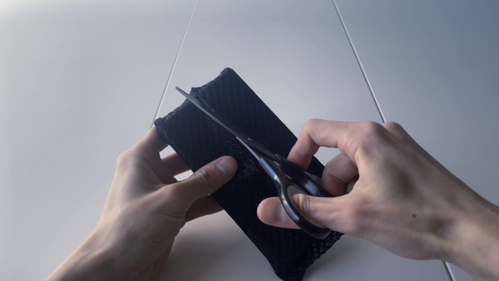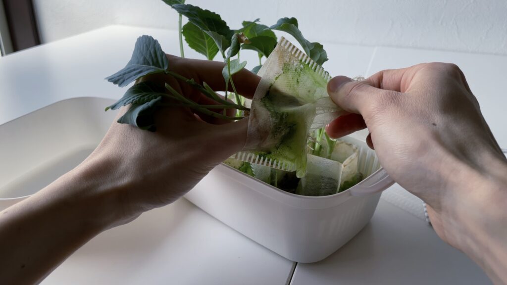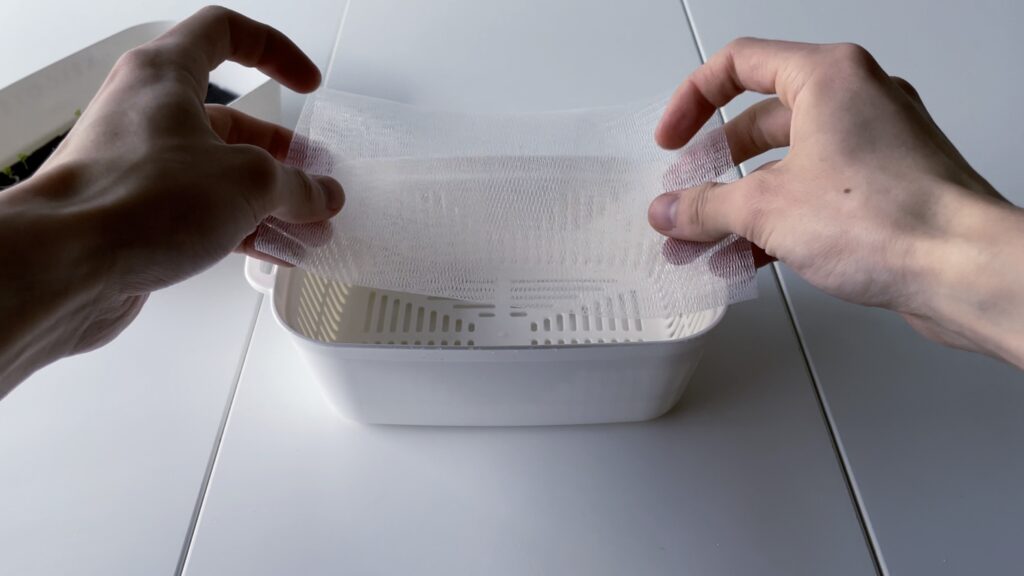 ②栽培容器の中に水切りネットを入れる(培地の代わり)