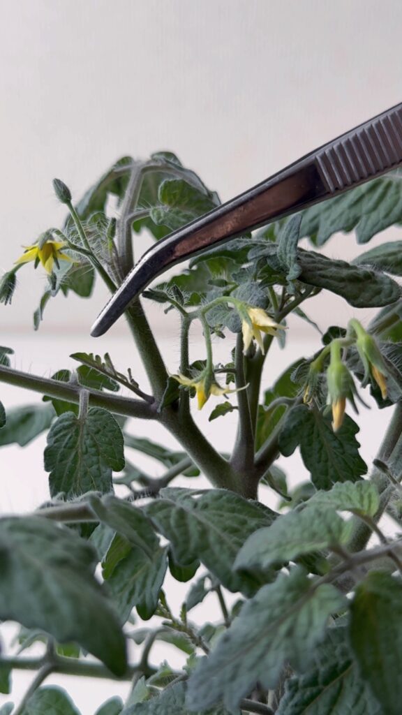 室内栽培は外と比べると風通しが悪いため花房を揺らして受粉する確率を高めました。